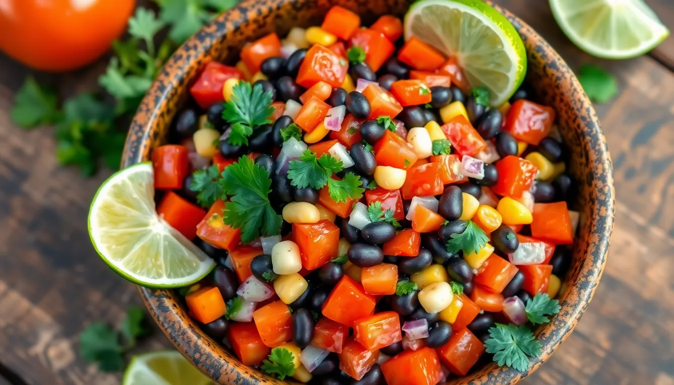 Fresh ingredients make black bean salad a vibrant dish. Combine canned or cooked black beans with diced tomatoes, chopped bell peppers, and red onions for a flavorful mix. Adding corn provides sweetness and texture, while cilantro enhances the overall taste. Squeeze lime juice over the salad for a refreshing finish. Each serving delivers high protein and fiber content, making it a satisfying option.